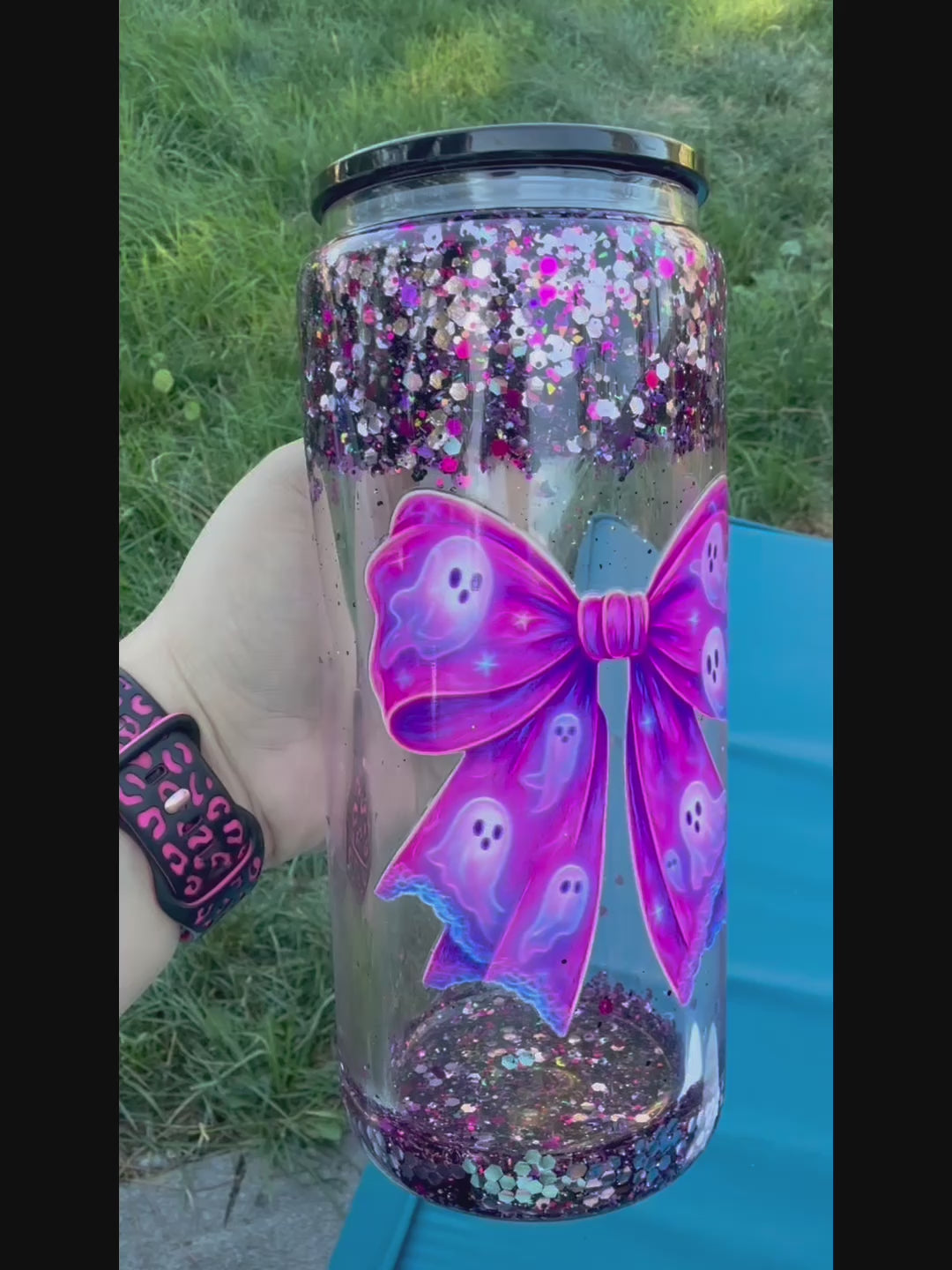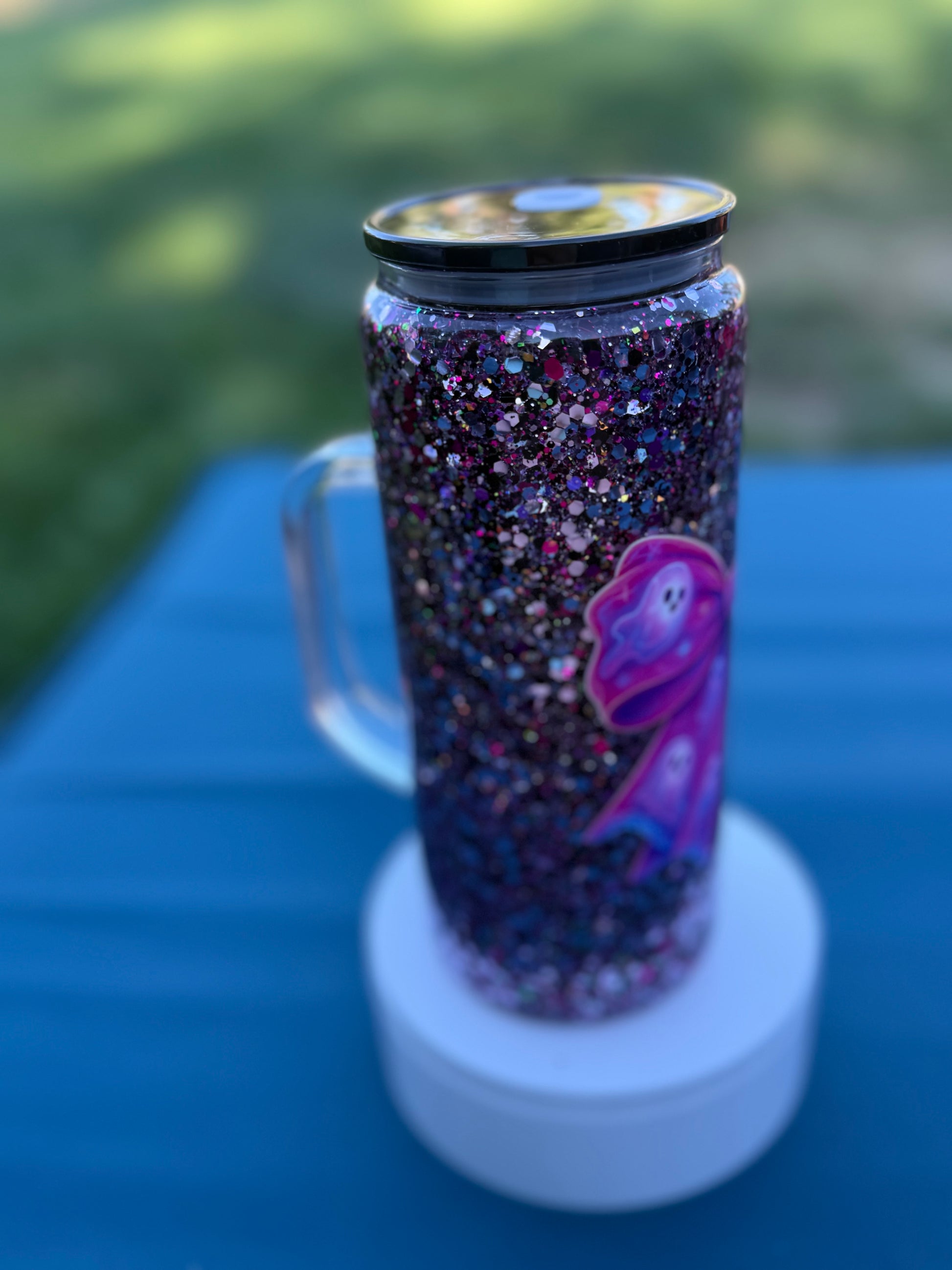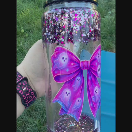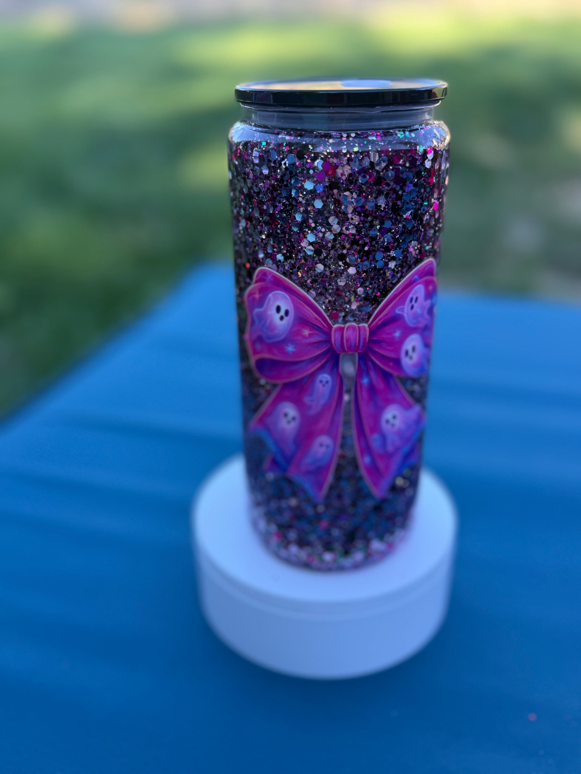 This is a 16oz Glass snow globe suspended flow! With this adorable ghosty bow and GOREGOUS glitter colors, you will definitely get compliments on how pretty this is! Drink your favorite cold beverage out of this or gift to someone who would adore it!